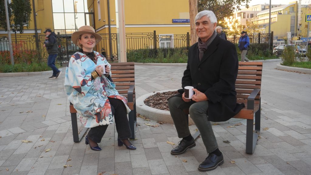 Съёмки выпуска «Кофе вне политики». Юлия Серебрянская и Рашид Калимуллин